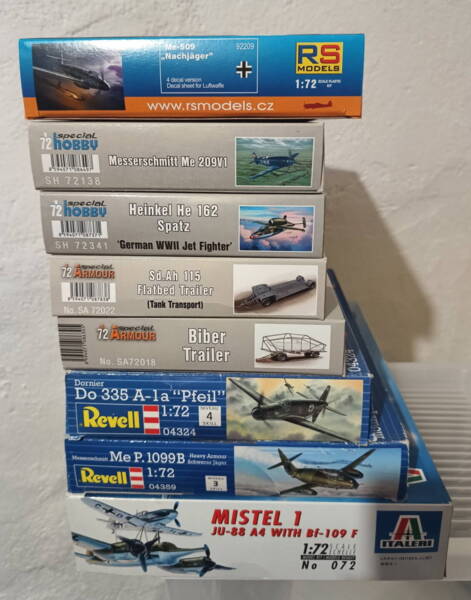PRODÁM1-72 Luftwaffe. Pouze platba předem na účet. Odeslání přes Zásilkovnu +89,- Kč. Stav viz. foto. Cena Special Hobby 250,- Kč/ks, RSmodels 370,-Kč, Revell 390,-Kč/ks, Italeri 611,-Kč + doprava.